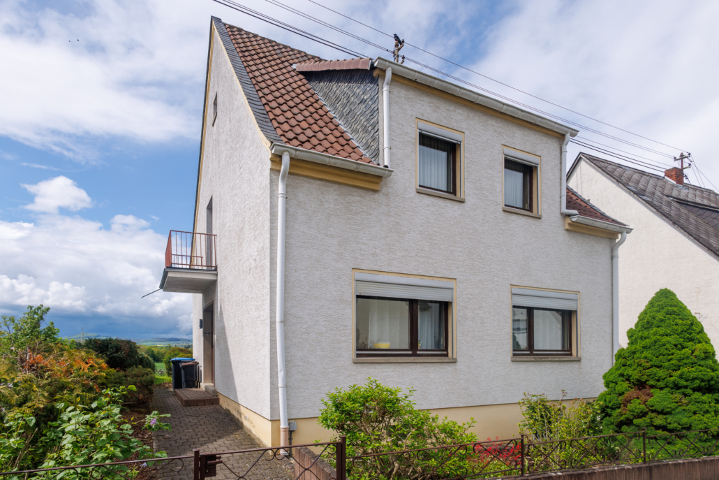 Die charmante Altbauimmobilie liegt am Ortsrand von Saffig mit freiem Blick über die Felder in die Pellenz. Ganz im Stil des Baujahres 1954 verfügt es über einen liebevoll angelegten Vorgarten. Der Hauseingang ist auf der linken Seite über einen breiten gepflasterten Weg zu erreichen, der ebenfalls in den Garten führt. Die Haustür öffnet sich zu einer geräumigen, einladenden Wohndiele mit Zugang zu allen Zimmern im Erdgeschoss, sowie über die Treppen ins Obergeschoss und in den Keller. Im Parterre befindet sich neben einem Gäste-WC mit Tageslicht in guter Größe, die Wohnküche sowie der Wohn-Essbereich. Dieser ansprechende Raum entstand durch die Öffnung und Zusammenlegung zweier ursprünglich kleinerer Zimmer. Er verfügt über den originalen Holzdielenboden und 2 große Fenster, die ein lichtes Ambiente schaffen. Unmittelbar ans Wohn-Esszimmer anschließend, aber natürlich auch über den Flur erreichbar, liegt die Wohnküche. Sie bietet ausreichend Platz für eine Küchenzeile mit Stau- und Arbeitsflächen und eine zusätzliche Essecke. Aus der Küche gelangt man durch eine Hebe-Schiebetür auf die große geflieste Loggia mit traumhaftem Ausblick ins Grüne und direktem Zugang zum pflegeleichten Garten in perfekter Größe. Im Obergeschoss, welches über die originale Holztreppe zu erreichen ist, befinden sich aktuell 2 Schlafzimmer, ein Büro und das Bad. Die beiden Schlafzimmer sind fast identisch groß und im Schnitt gespiegelt. Dank der Gauben nehmen die Schrägen kaum Raum, tragen aber zum Charme der Zimmer bei.Das Büro verfügt über einen Balkon sowie einen atemberaubenden Blick ins Grüne und könnte aufgrund seiner Größe ebenso als Schlafraum fungieren. Über einen kleinen Flur mit Einbauschrank erreicht man das Bad, welches im Jahr 1980 angebaut wurde. Mit ca. 8m² und einem großen Fenster bietet auch dieser Raum ausreichend Platz für Ihre Gestaltungsideen. Das gesamte Obergeschoss, abgesehen vom Bad ist derzeit mit Teppich ausgelegt. In den 1990er Jahren wurde zudem der Spitzboden ausgebaut. Über eine Holztreppe am Rande der Diele erreicht man ein kleines Plateau mit Zimmertür, hinter welchem sich ein ca. 15 m² großer Raum auftut. Dieser könnte als Büro, Kinderzimmer, Hobbyraum oder Gästebereich genutzt werden. Im Keller des Einfamilienhauses befinden sich neben dem Hauswirtschaftsraum mit Zugang zum Garten, zwei Abstellräume in unterschiedlichen Größen, ein Duschbad sowie ein Bonusraum für vielfältige Nutzungsideen. Abgerundet wird das Angebot durch eine voll ausgestattete Einzelgarage mit Überlänge, die somit Platz für Fahrräder, Gartengeräte und Co. bietet. Highlight der Immobilie ist die herrliche Aussicht auf die Felder, die sich natürlich auch hervorragend aus dem Garten genießen lässt.