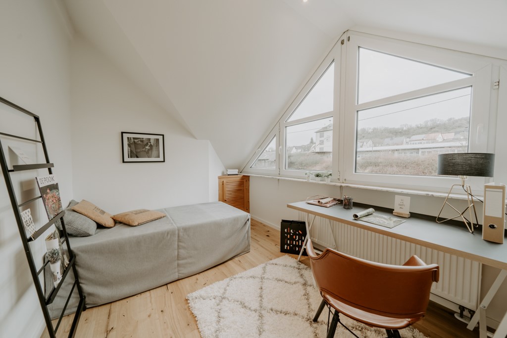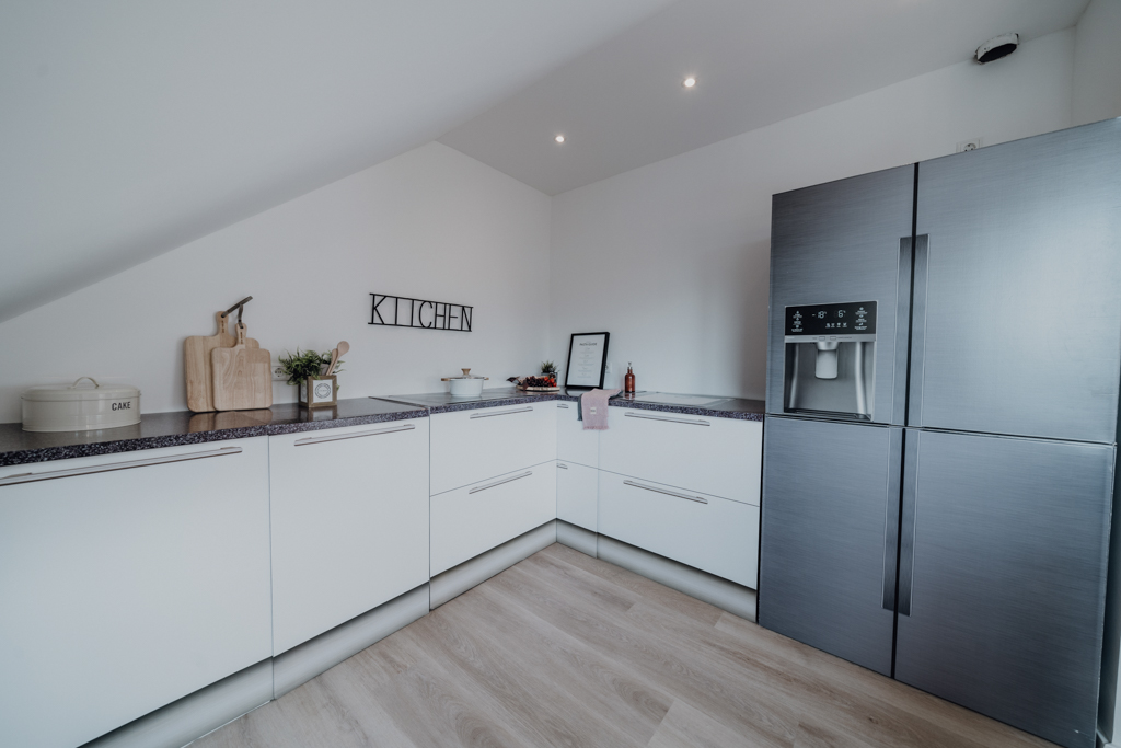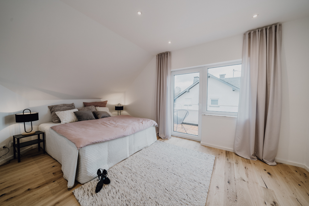 Die Wohnung umfasst 3 Zimmer auf ca. 97m² und befindet sich im 2. Obergeschoss der Immobilie. Unmittelbar von der Wohnungstür entfaltet sich der offene, fast 50m² große Wohn-Küchen- und Essbereich. Durch die gekonnte Intergration der Dachschrägen sowie die teilweise dreieckigen Fenster wirkt dieser Bereich besonders hell, modern und einladend. Über einen Flur gelangt man in die weiteren Zimmer. Rechter Hand befindet sich ein geräumiger Schlafbereich, der ebenso wie das Wohnzimmer Zugang zu den Balkonen ermöglicht. Das großzügige Wellnessbad mit bodentiefer Dusche, Eckbadewanne und großem Fenster schließt unmittelbar an. Das dritte Zimmer eignet sich aufgrund seiner Architektur hervorragend als Büro, Babyzimmer oder begehbarer Kleiderschrank. Die gesamte Wohnung verfügt über ein durchgehend verlegtes, hochwertiges Echtholzparkett und ist mit LED Deckenspots ausgestattet. Das Badezimmer wurde mit 120×60 cm großen Fliesen hochwertig gestaltet.