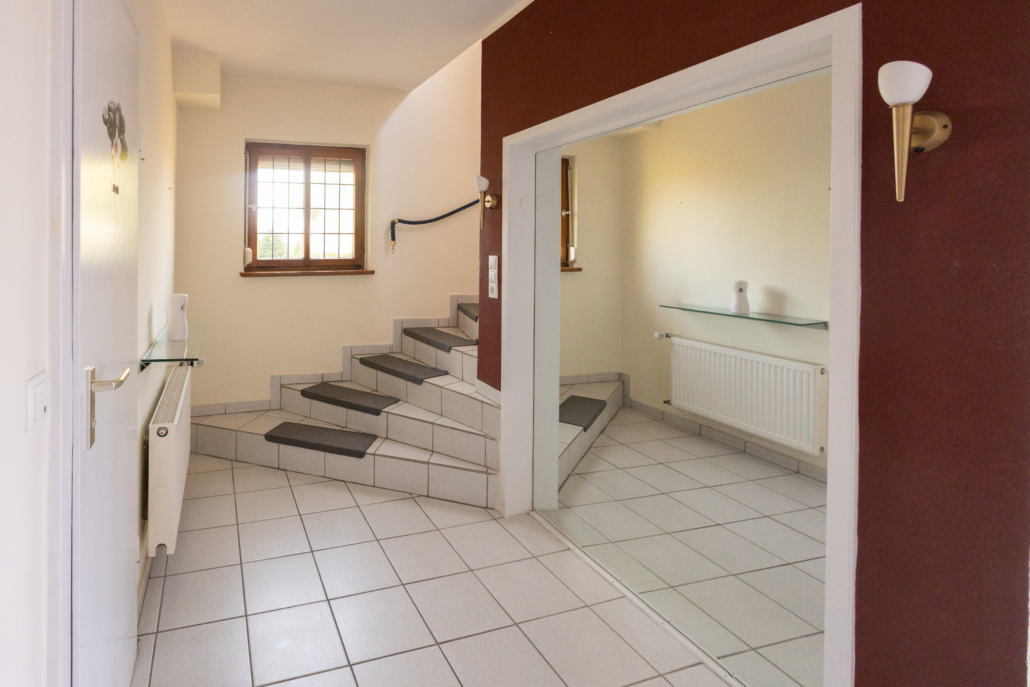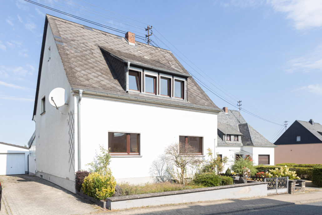 Das charmante Einfamilienhaus liegt am Ortsrand von Saffig mit Blick auf die Felder. Ganz im Stil des Baujahres 1955 verfügt es über einen Vorgarten. Der Hauseingang ist auf der rechten Seite über einen breiten gepflasterten Weg zu erreichen, der ebenfalls in den Garten führt. Die Haustür öffnet sich zu einem geräumigen, einladenden Flur mit hellen Fliesen und Zugang zu allen Zimmern im Erdgeschoss,sowie über die Treppen ins Obergeschoss und in den Keller. Im Parterre befindet sich neben einem zeitlos weiß gefliesten Gäste-WC im vorderen Areal, der großzügige Wohn-Essbereich. Dieser ansprechende Raum entstand durch die Öffnung und Zusammenlegung zweier ursprünglich kleinerer Zimmer. Er verfügt über hellen Laminatboden und zwei große Fenster, die ein lichtes Ambiente schaffen. Unmittelbar ans Wohn-Esszimmer anschliessend, aber natürlich auch über den Flur erreichbar, liegt die Wohnküche. Dieser Raum besticht nicht nur durch seine Größe, sondern durch weitere praktische Details. So befindet sich im hinteren Bereich eine kleine begehbare Speisekammer, die auch als Abstellraum genutzt werden kann. Die Küche ist mit einer klassischen, weißen Einbauküche im Landhausstil ausgestattet, die viel Stauraum und Arbeitsfläche bietet. Auch für einen Essplatz/eine Frühstücksecke bietet der Raum problemlos Platz. Aus der Küche gelangt man in den Wintergarten, der in den 1980er Jahren an die Immobilie angebaut wurde. Gemauert und weiß gefliest, bietet er, gepaart mit vielen Fenstern und einem Zugang zum Garten, einen fließenden Übergang zwischen dem Innen- und Außenbereich. Die grünen Fenster- und Türladen unterstreichen den Landhauscharakter. Im Obergeschoss, welches über ein breites gefliestes Treppenhaus zu erreichen ist, befinden sich aktuell 2 Schlafzimmer und ein Bad. Linker Hand wurden 2 Schlafräume zu einem „Doppelzimmer“ umfunktioniert, so dass ein Durchgangszimmer mit einem dahinter liegenden Schlafbereich entstand. Dies könnte im Sinne eines Schlafzimmers mit begehbarem Kleiderschrank oder Büro genutzt werden. Da der hintere Raum im Ursprungsbau jedoch auch vom Flur aus zugänglich war, sollten sie sich auf Wunsch auch wieder in 2 separate Schlafräume zurück bauen lassen. Das zweite Zimmer hat eine gute Größe und ist dank zweier Fenster sehr hell und einladend. Es könnte als Büro oder Kinderzimmer fungieren. Das helle, weiß geflieste Tageslichtbad mit Dusche hat einen modernen Look und verfügt über zusätzlichen Stauraum. Spitzboden und Keller bieten zudem Abstellmöglichkeiten und Platz für Waschmaschine und Trockner. Abgerundet wird das Angebot durch einen kleinen, uneinsehbaren, liebevoll angelegten Garten und eine Einzelgarage.
