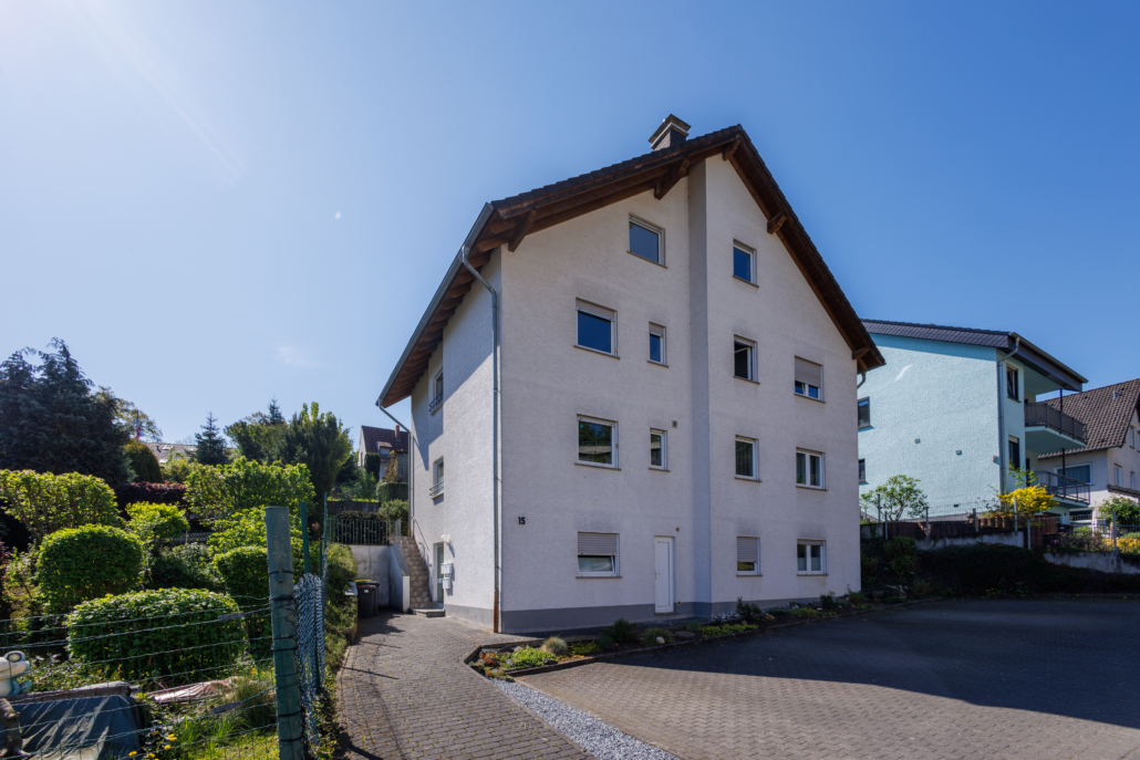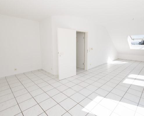 Die helle Zweizimmerwohnung verfügt über 75 m² Wohnfläche und befindet sich als einzige Wohnung im Dachgeschoss eines 5 Parteienwohnhauses in hervorragender Lage von Andernach. Das Haus wurde im Jahr 1994 erbaut und präsentiert sich insgesamt in einem sehr gepflegten Zustand. Über ein Baujahr typisches Treppenhaus erreicht man die Wohnung im Dachgeschoss. Die Wohnungstür öffnet sich zu einem zentralen Flur, der wie alle anderen Räume weiß gefliest ist. Von hier aus sind alle Zimmer zugänglich. Rechterhand befindet sich das helle Schlafzimmer, welches trotz der Dachschrägen viel Platz und Gemütlichkeit bietet. Daneben liegt das Tageslichtbad mit Wanne und Dusche. Hier befindet sich zudem die Gastherme, da alle Wohnungen mit Etagenheizungen betrieben werden. Schräg gegenüber der Eingangstür liegt die kleine aber feine Küche. Sie ist ebenfalls hell gefliest und wirkt dank des großen Dachfensters hell und freundlich.