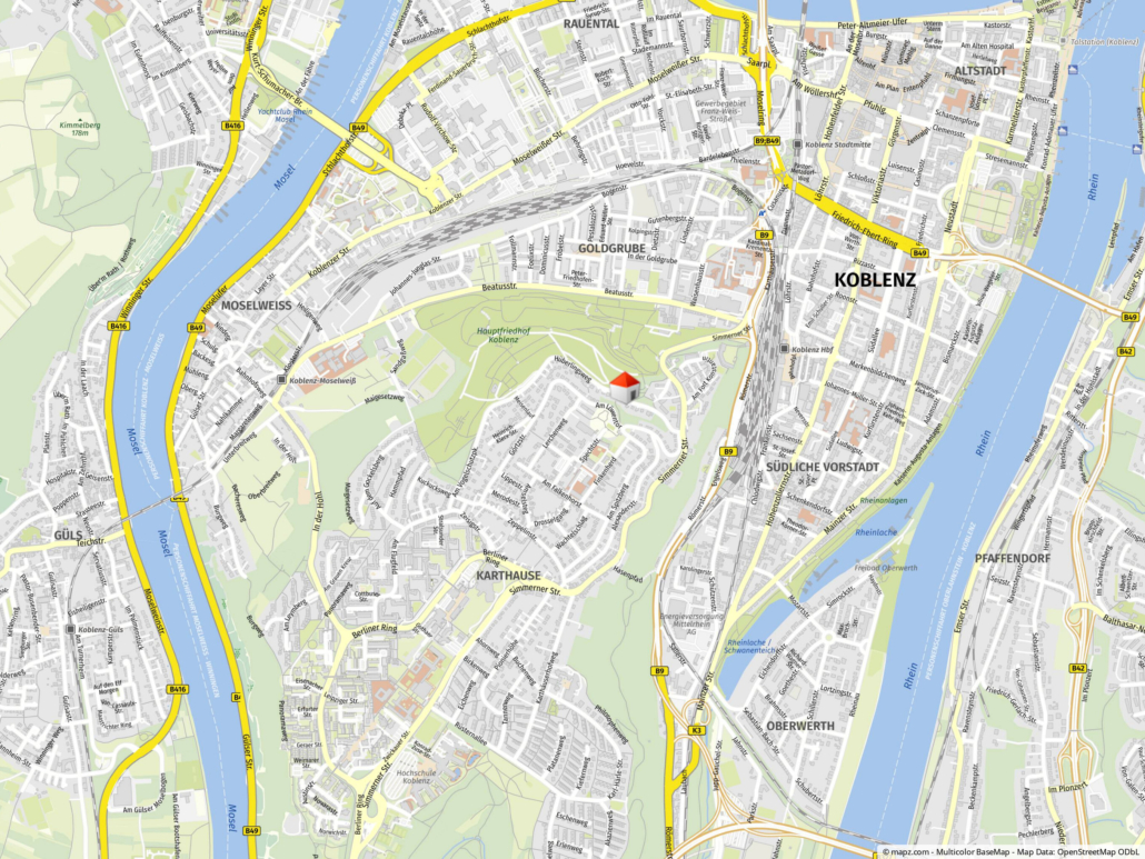 Die Maisonettwohnung befindet sich in einem Dreifamilienhaus im beliebten und größten Koblenzer Stadtteil Karthause. Sie ist in unmittelbarer Nähe des Hauptfriedhofs sowie des Arboretums angesiedelt und ist dementsprechend ruhig & grün gelegen, entbehrt aber keineswegs einer hervorragenden Verkehrsanbindung. Ins Stadtzentrum von Koblenz gelangen Sie bequem per Bus (mit Haltestelle in Laufdistanz) oder sogar zu Fuß in ca. 2,8 km. Die Auffahrt zur Bundesstraße 9 liegt in 800 m Entfernung und ermöglichte eine perfekte Anbindung an die Autobahnen 48 und 61, so dass das Ballungsgebiet Rhein/Main ebenso in ca. 60 Fahrminuten zu erreichen ist wie das Ballungszentrum Köln/Bonn. Mit der Deutschen Bahn benötigt man ca. 1 ½ Stunden. Die Stadt Koblenz selbst, mit Ihren knapp 120 000 Einwohnern, ist vor allen Dingen durch ihre einmalige Lage am Zusammenfluss von Rhein und Mosel bekannt. Außerdem bietet die drittgrößte Stadt in Rheinland-Pfalz alle infrastrukturellen Annehmlichkeiten einer kreisfreien Stadt dieser Größenordnung. Das medizinische/ Kita- und Schul- sowie Einzelhandelsangebot variiert je nach Stadtteil, alle Örtlichkeiten des täglichen Bedarfs sind jedoch problemlos mit öffentlichen oder privaten Verkehrsmitteln zu erreichen.