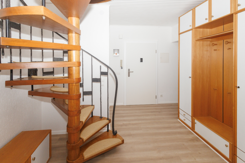 Über ein helles Treppenhaus gelangt man zur Wohnungstür, die sich zu einer ansprechenden Diele mit ausreichend Stauraum für Ihre Garderobe öffnet. Mittig ist die schöne Wendeltreppe aus Eichenholz & gusseisernem Geländer platziert, die zur 2. Ebene führt. Rechterhand befindet sich das helle, lichtdurchflutete Wohnzimmer, dass mit seinem charmanten Kachelofen eine gelungene Kombination aus Tradition und Moderne schafft. Dank der großen Fensterfront und dem Zugang zum Süd-West-Balkon wirkt dieser Raum besonders einladend.Auf der gegenüberliegenden Seite mit Blick in den Garten befinden sich die kleine, gut ausgestattete Küche und das angeschlossene Esszimmer. Daneben liegt das geräumige Schlafzimmer mit 2 großen Fenstern. Kombiniert mit der leichten Dachschräge entsteht hier ein Gefühl von Gemütlichkeit. Angrenzend an den Schlafbereich wurde das 2017 vollständig sanierte Duschbad gestaltet. Mit hellen Grautönen und abgesetzten roten Elementen erhält es einen coolen Touch. Hier befinden sich zudem die Gasetagenheizung aus 2007 und der Waschmaschinenstellplatz. Auf der anderen Seite des Bads schließt sich ein weiterer Raum in guter Größe an, der als Kinderzimmer oder Büro fungieren könnte.