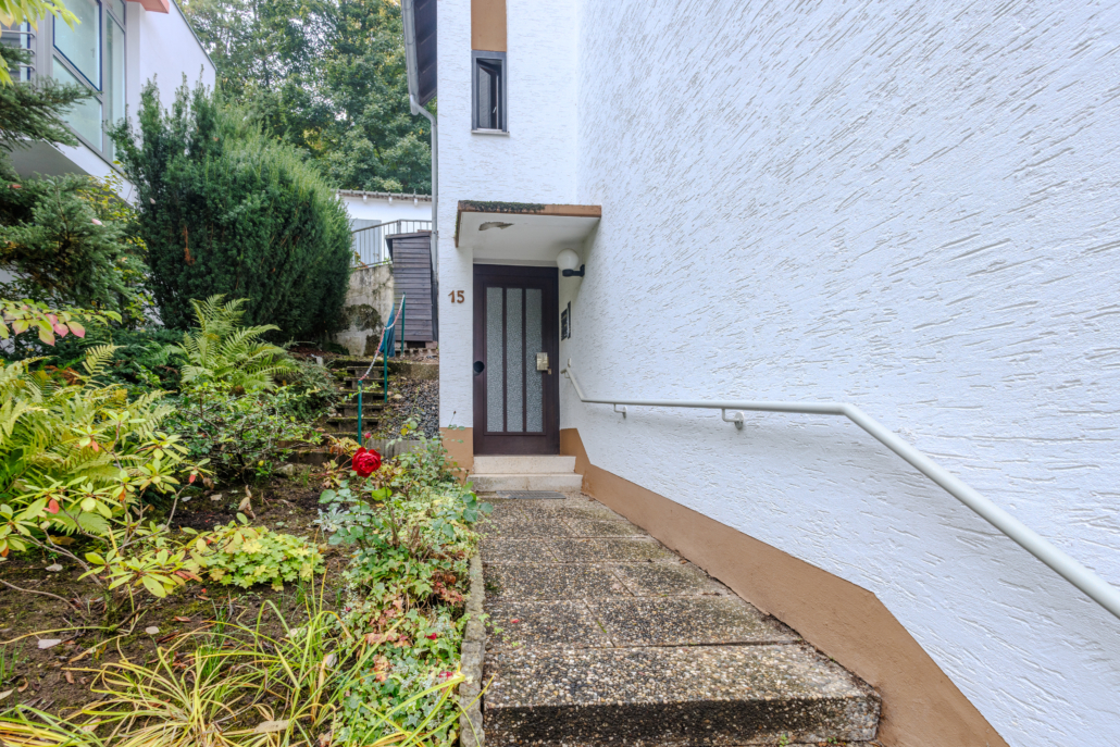 Abgerundet wird das Immobilienangebot durch einen ca. 12 m² großen Kellerraum und eine Einzelgarage mit elektrischem Schwenktor. Auf der Stellfläche vor der Garage kann bequem ein zweites Fahrzeug geparkt werden. Als Add-on gehört der seitliche Bereich neben dem Hauseingang zur Wohnung. Dort befindet sich ein praktischer Unterstand zur Holzlagerung. Leider verfügt das Haus nicht über einen Aufzug.