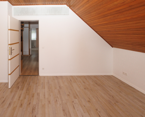 Das Dachgeschoss der Maisonettewohnung wurde 2021 weitestgehend modernisiert. Ausgestattet mit neuer Elektrik, modernen Fußböden und Anstrichen wirkt die Ebene hell und freundlich. Über einen kleinen Flur mit Abstellnische erreicht man die beiden gegenüberliegenden Zimmer. Der Raum zur Straße hin bietet eine phänomenale Aussicht und ist mit verschiedenen Regaleinbauten optimal auf eine Nutzung als Homeoffice oder Hobbyraum ausgerichtet. Das zweite Zimmer liegt zum Garten heraus. Highlight ist hier in jedem Fall die Loggia mit Blick ins Grüne und die große Fensterfront.