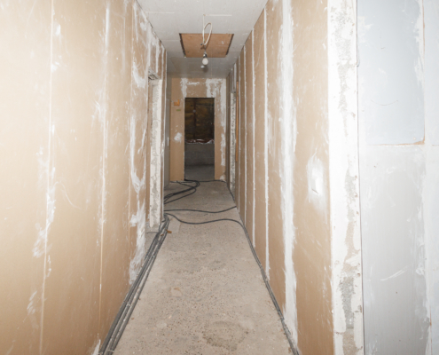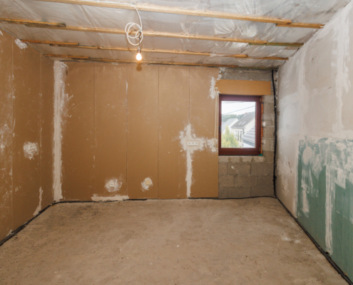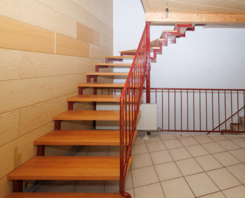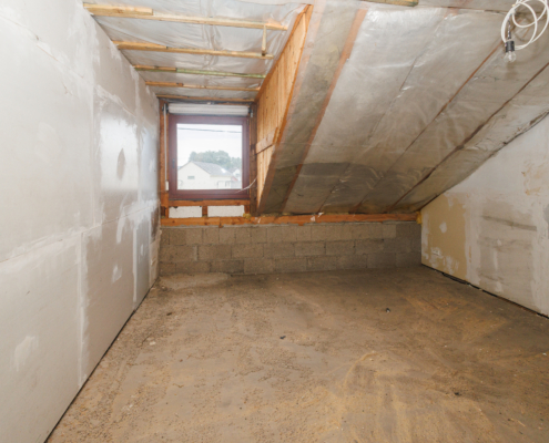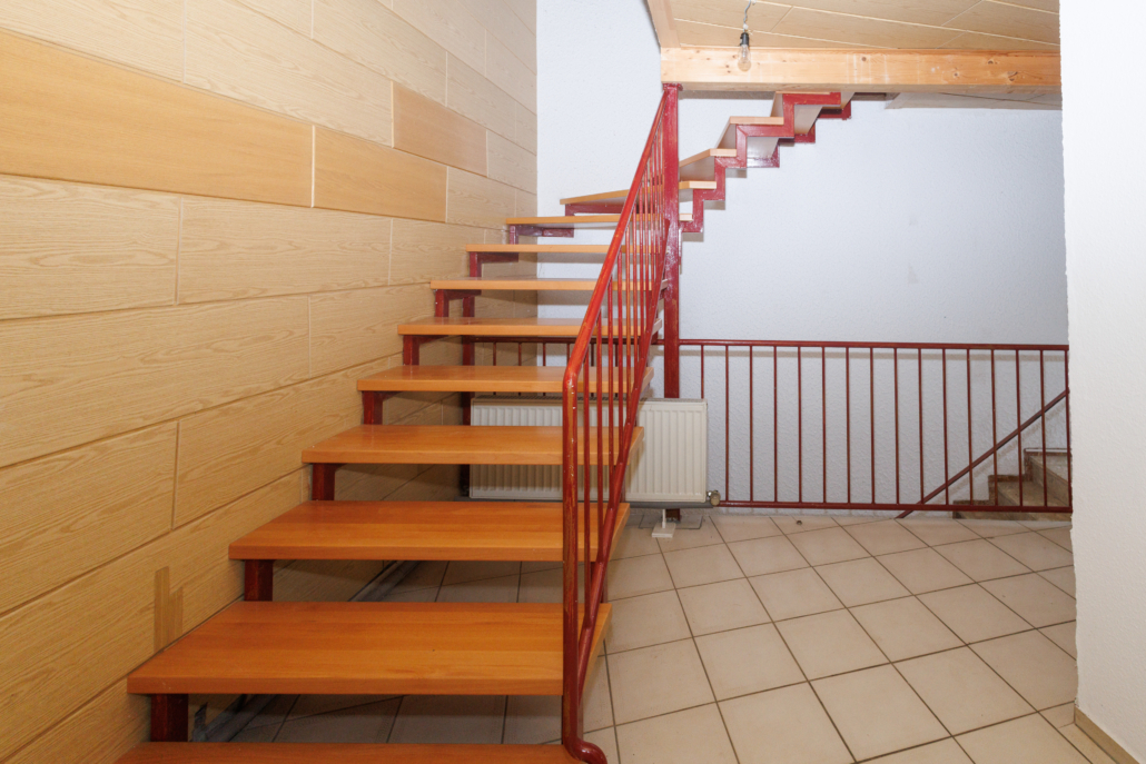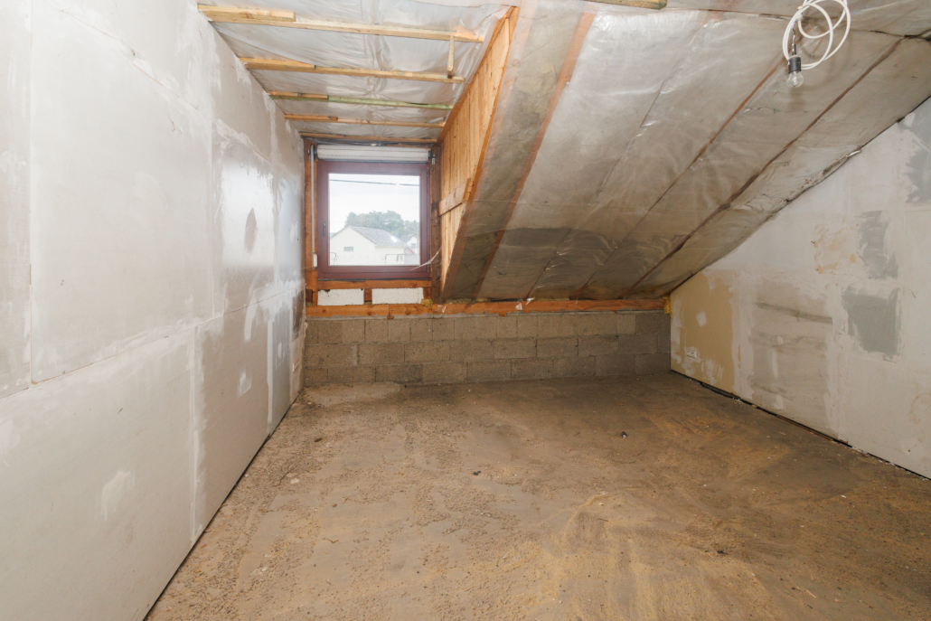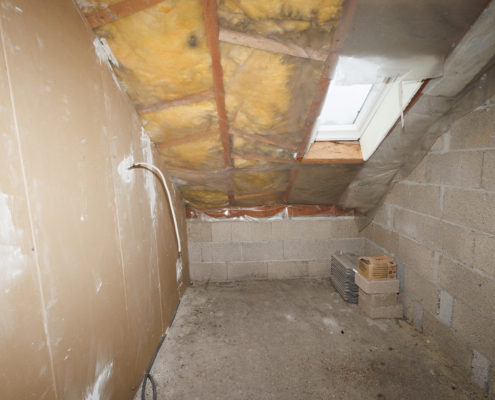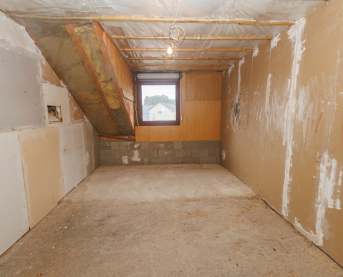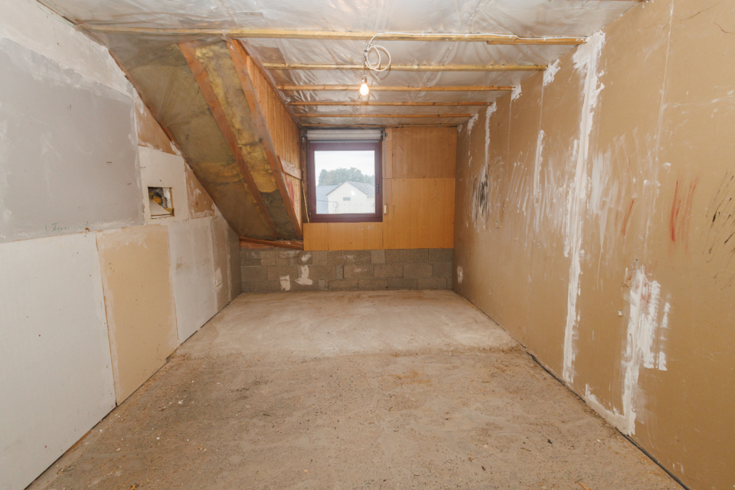 Über eine moderne Holz-Metalltreppe gelangt man ins Dachgeschoss, welches 1998 aufgestockt wurde und sich seitdem im Rohbauzustand befindet. Auf dieser Ebene befinden sich neben einem zentralen Flur, insgesamt 5 Zimmer, die Sie nach Ihren Ideen und Vorstellungen ausbauen und gestalten können. Die Elektrik wurde bereits verlegt, ansonsten wurden keine Leitungsarbeiten vorgenommen. Das Dach wurde mit Gauben versehen und mit Betondachpfannen gedeckt. Die Dämmung entspricht den gängigen Vorgaben des Jahres 1998 und wäre unter derzeitigen GEG- Richtlinien anzupassen.