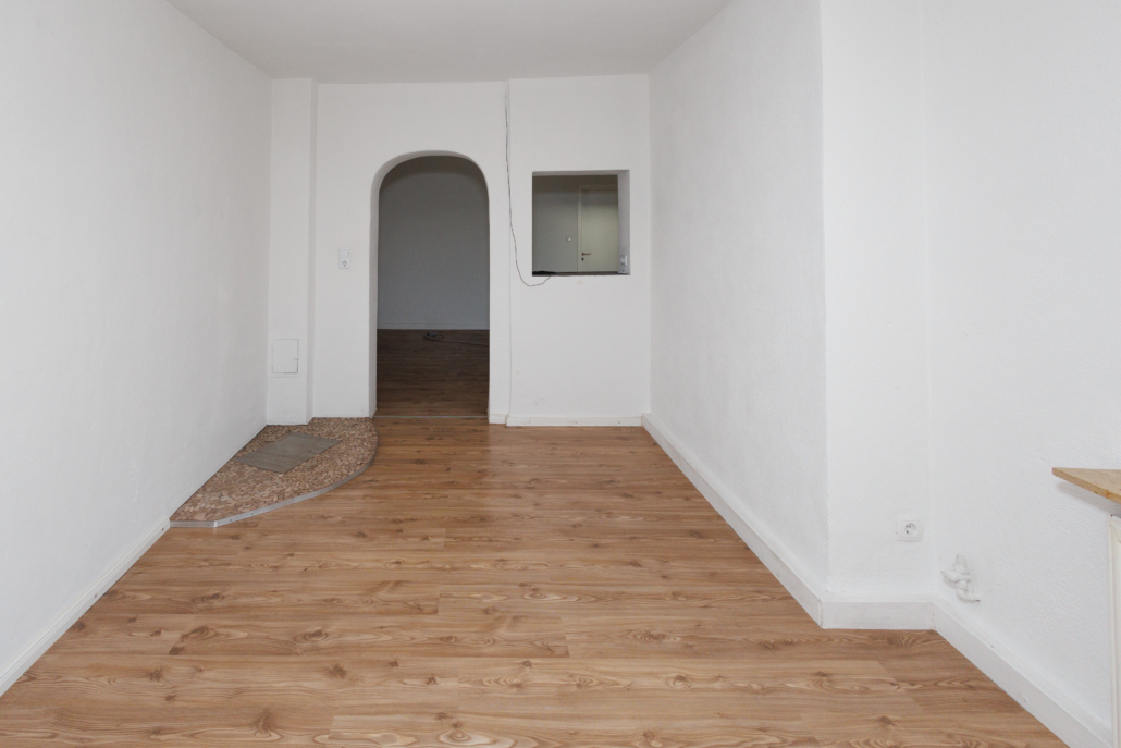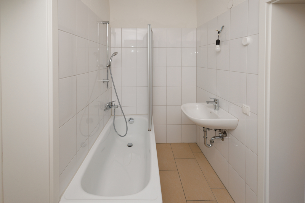 Die Wohnung verfügt über 2 helle, etwa gleich große Räume die zur Straße hin gelegen sind und als Wohn- und Schlafzimmer konzipiert wurden. Neben der zentralen Küche befindet sich das zeitlose Bad und daran angrenzend ein Abstellraum, welcher derzeit ein Feuchtigkeitsproblem aufweist. Die Toilette ist in dieser Wohnung separat im Flurbereich untergebracht, so dass der Eindruck einer Gästetoilette entsteht.