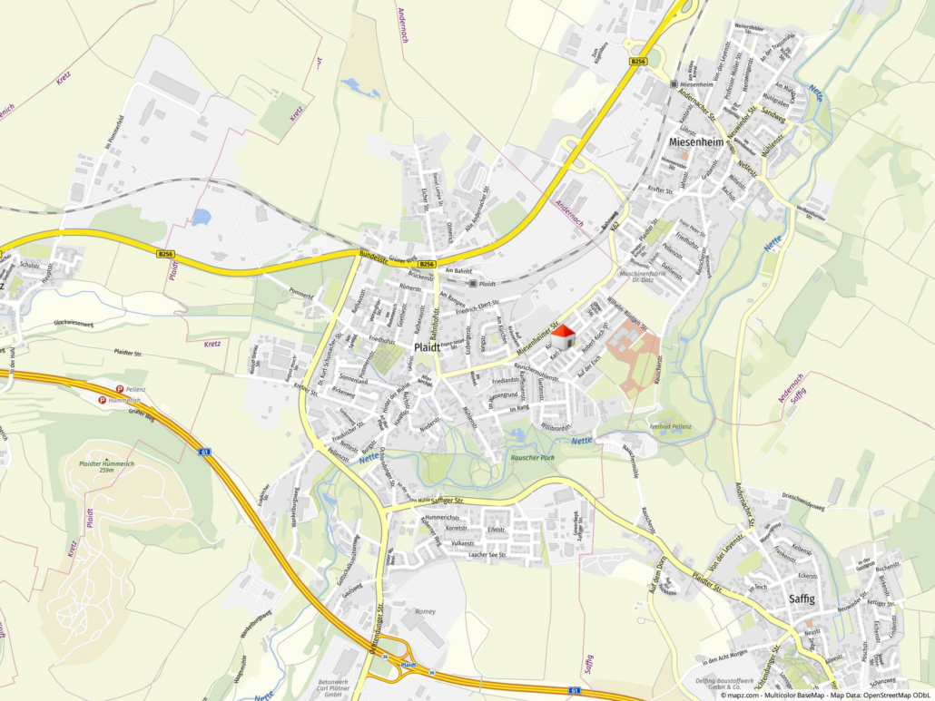 Die zwei Zweifamilienhäuser befinden sich auf einem Grundstück mit gemeinsamem Innenhof in einer ruhigen Ortslage von Plaidt. Die Ortsgemeinde Plaidt ist mit ca. 6000 Einwohnern die größte Ortschaft der Verbandsgemeinde Pellenz, deren Verwaltung ebenfalls im Ort angesiedelt ist. Verkehrstechnisch ist Plaidt dank der Anbindung an die Bundesstraße 256 und die eigene Autobahnaus- bzw. auffahrt zur A61 perfekt gelegen. Die Stadt Andernach ist in 7 Fahrminuten zu erreichen, Neuwied, Mayen und Koblenz liegen in 15-20 Minuten Entfernung, sind aber ebenfalls problemlos durch die öffentlichen Verkehrsmittel Bus UND Bahn angebunden. Das Ballungsgebiet Köln/Bonn lässt sich in gut 60 Fahrminuten erreichen, Rhein/Main in ca. 90 Minuten. Die Infrastruktur im Ort ist als hervorragend zu bezeichnen. Plaidt verfügt über 2 Kindertagesstätten, eine Grundschule sowie eine Integrierte Gesamtschule. Alle weiteren Schultypen können per Bus & Bahn in Andernach, Mendig oder Mayen besucht werden. Supermärkte, ein Drogeriemarkt, verschiedene Bäcker, ein Metzger, sowie weitere Geschäfte des täglichen Bedarfs sind vor Ort angesiedelt.