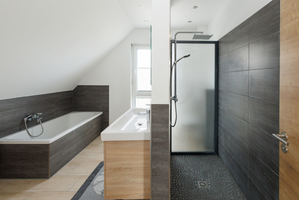 Das moderne KfW 55 Haus wurde im Jahr 2020 in Holzständerbauweise durch die renommierte Firma Allkauf errichtet. Der seitlich liegende Eingang bietet zusätzlich zur ruhigen Ortsrandlage noch mehr Privatsphäre. Die Haustür öffnet sich zu einem ansprechenden zentralen Flur, mit modernem dunklen Fußboden. Links liegt das Gäste WC, welches aufgrund seiner komfortablen Größe ausreichend Platz für eine ebenerdige Dusche bietet, so dass das Haus über 2 vollwertige Bäder verfügt. Auf der rechten Seite befindet sich der Hausanschluss/Technikraum mit integriertem Hauswirtschaftsraum. Hier befinden sich neben der neuwertigen Gasbrenntwerttherme und dem Warmwasserspeicher die Technik für die Photovoltaikanlage. Diese ist für eine monatliche Rate von 300 € von der Firma Enpal gemietet und versorgt die Immobilie aktuell mit Strom und Warmwasser. Bei Umrüstung auf eine Wärmepumpe wäre das Haus, aufgrund der Leistung von 15,9 KW autark zu betreiben.Im Hauswirtschaftsraumbereich wurde die Waschmaschine rückenschonend erhöht gesetzt und unmittelbar unter dem Wäscheschacht aus dem Bad im OG platziert. Darüber hinaus bietet sich Stauraum für Reinigungsgeräte und Co..