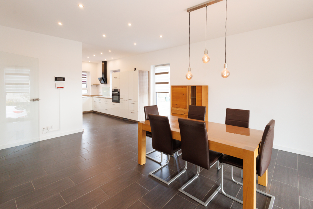 Im hinteren Bereich öffnet sich der Flur zu einer geräumigen Garderobe neben der sich zum einen der Aufgang zum Obergeschoss befindet und zum anderen der Zugang in den hellen, offen gestalteten Wohn-Ess-Küchenbereich. Dank teilweise bodentiefer Fenster mit Zugang zur teilüberdachten Terrasse sowie in den Garten wirkt dieser Raum sehr hell, großzügig und einladend. Er ist in L- Form geschnitten, so dass sich trotz des offenen Raumkonzepts eine klare Trennung der Bereich realisieren lässt. Die moderne weiße Hochglanzküche ist im Kaufpreis inbegriffen und verfügt über eine geräumige Speise- und Abstellkammer mit Schiebetür. Der Wohn-Ess-Bereich ist großzügig gehalten und bietet viel Raum für die Familie und Freunde.