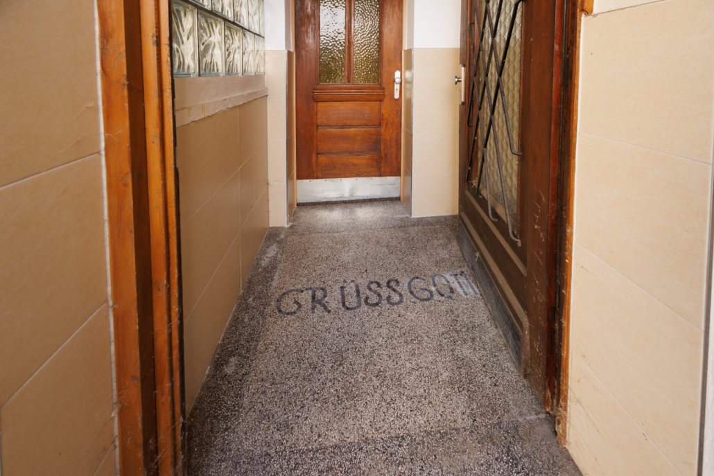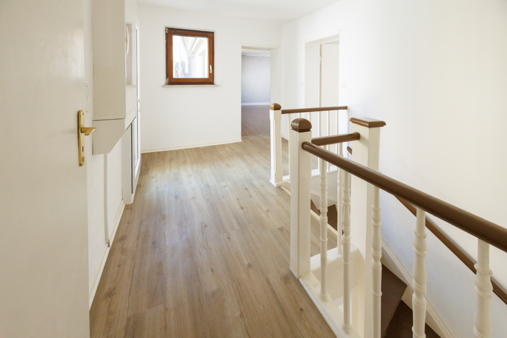 Durch die ansprechende originale Hauseingangstür gelangt man zunächst einmal in einen Windfang, der mit einem – „Grüss Gott“ im Terrazzoboden eingelassen – freundlich begrüßt. Hinter einer zweiten Holzeingangstür öffnet sich dann das eigentliche Wohnhaus mit geräumigem Dielenbereich, der ausreichend Fläche für die Garderobe bietet. Linker Hand befindet sich hier eine Tür, die direkt in die Garage führt, so dass die Einkäufe auch bei Regen trockenen Fußes ins Haus gebracht werden können. Daneben liegt das frisch sanierte Duschbad mit Waschmaschinenanschluss in modernen Grau- und Weißtönen und mit Tageslicht. Außerdem liegt in diesem Bereich noch der Kellerzugang. Der Keller ist nur unter einem Teil der Immobilie gelegen und dem Baujahr entsprechend ein Bruchsteinkeller ohne festen Fußboden oder Abdichtung zum Erdreich. Rechter Hand führt der Flur zu den wesentlichen Wohnräumen: Küche, Esszimmer und Wohnzimmer. Die Wohnküche ist sehr geräumig und mit zwei großen Fenstern und dem neuen weißen Fliesenspiegel hell gestaltet. Der Fußboden ist wie im Flur und Eingangsbereich der ursprüngliche Terrazzoboden, der einer Aufarbeitung oder Neugestaltung bedarf. Das gegenüberliegende Esszimmer wurde mit cremefarbenen Feinsteinfliesen zeitgemäß gestaltet und wirkt durch die schräg verlaufende Außenwand besonders. Am Ende des Flurs liegt das Wohnzimmer, welches trotz der beiden großen Fenster ausreichend Stellfläche bietet und mit einem neuen zeitlosen Eichenlaminat versehen wurde. Über die originale Holztreppe, die farblich harmonisch in weiß und braun gehalten wurde, erreicht man das Obergeschoss. Hier befindet sich ein weiteres Duschbad mit Oberlicht. Rechterhand liegt ein großer Raum oberhalb der Garage mit breiter Fensterfront, einem nützlichen Einbauschrank und lackiertem Holzdielenboden. Am anderen Ende des Flurs befinden sich 2 weitere Zimmer, die über ein mittig liegendes Durchgangszimmer miteinander verbunden sind. Alles Räume verfügen über dasselbe Eichenlaminat wie im Wohnzimmer, haben eine gute Größe und jeweils 2 große Fenster. In einem der beiden Räume befindet sich außerdem der Aufgang zum Spitzboden, der als Stauraum genutzt werden kann. Abgerundet wird die Ebene durch den Balkon oberhalb des Windfangs, welcher mit Blick in den Hof gemütlich gestaltet werden kann.