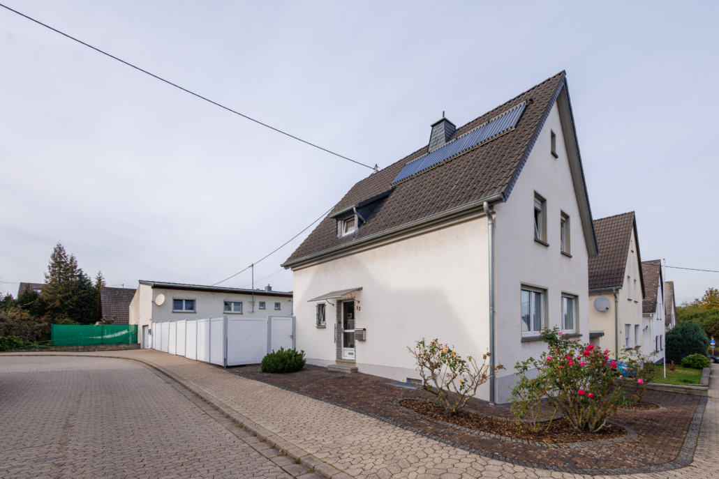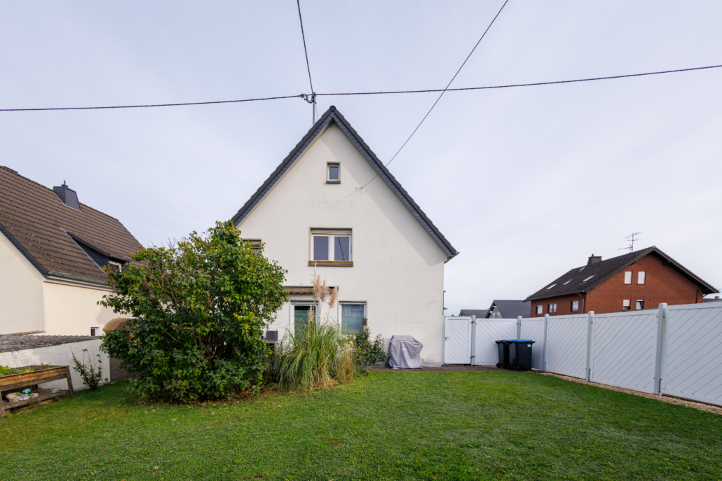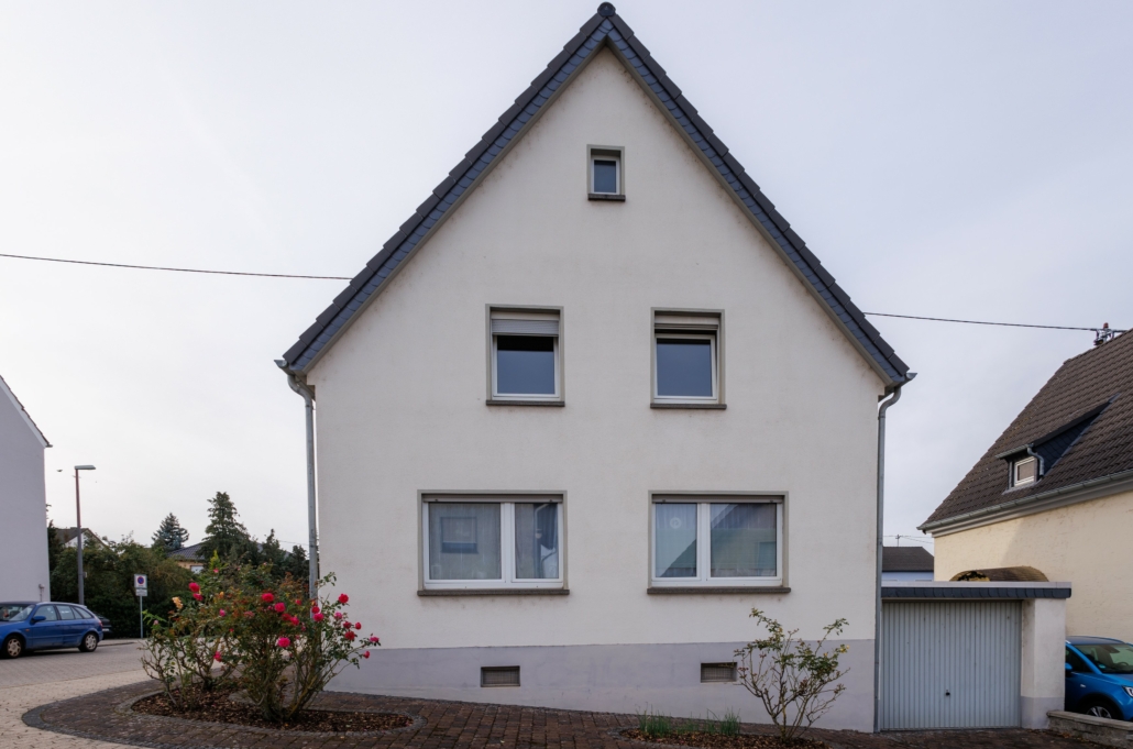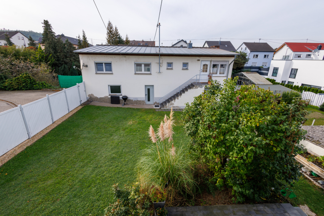 Das Nebengebäude welches sich auf der gegenüberliegenden Seite des Gartenbereiches befindet wurde ebenfalls in den Jahren 1956/57 als Anbau und damit Grenzbebauung zu einem Gebäude auf dem Nachbargrundstück, errichtet. Es ist zwei stöckig gebaut, wobei das Erdgeschoss als Nutzfläche und das Obergeschoss als Wohnbereich dient. Die ca. 65 m² große Wohnung wurde 2021 vollständig renoviert und ist über eine außenliegende Basalttreppe zu erreichen. Die Wohnungstür öffnet sich zu einem einladenden Flur, von welchem rechter Hand ein leicht L-förmig geschnittener Raum abgeht. Dieser ließe sich als Büro, Kinderzimmer, Hobbyraum oder ähnliches nutzen. Linker Hand erreicht man das schmale aber ansprechend und modern gestaltete Bad mit ebenerdiger Dusche, sowie den gemütlichen Wohnbereich. Von diesem erreicht man zum einen die innenliegende, geräumige und modern gestaltete Küche sowie das große, helle Schlafzimmer. Im Erdgeschoss befindet sich eine große (4,5×7 m) Garage mit Grube und viel Raum für Fahrzeuge, Werkzeuge, Gartengeräte und Co. Darüber hinaus sind zwei weitere Räume vorhanden, die zum einen als Hauswirtschaftsraum, zum anderen als Lagerraum dienen. Hier befindet sich ebenfalls die separate Gas-Etagenheizung aus dem Baujahr 1995. Abgerundet wird das Angebot durch den ansprechend aber pflegeleicht angelegten Garten mit der weißen Holzeinzäunung, die auf der gesamten Außenseite für Sichtschutz und Privatsphäre sorgt und den unkompliziert aber modern gestalteten Vorgarten im Eckbereich des Grundstücks.
